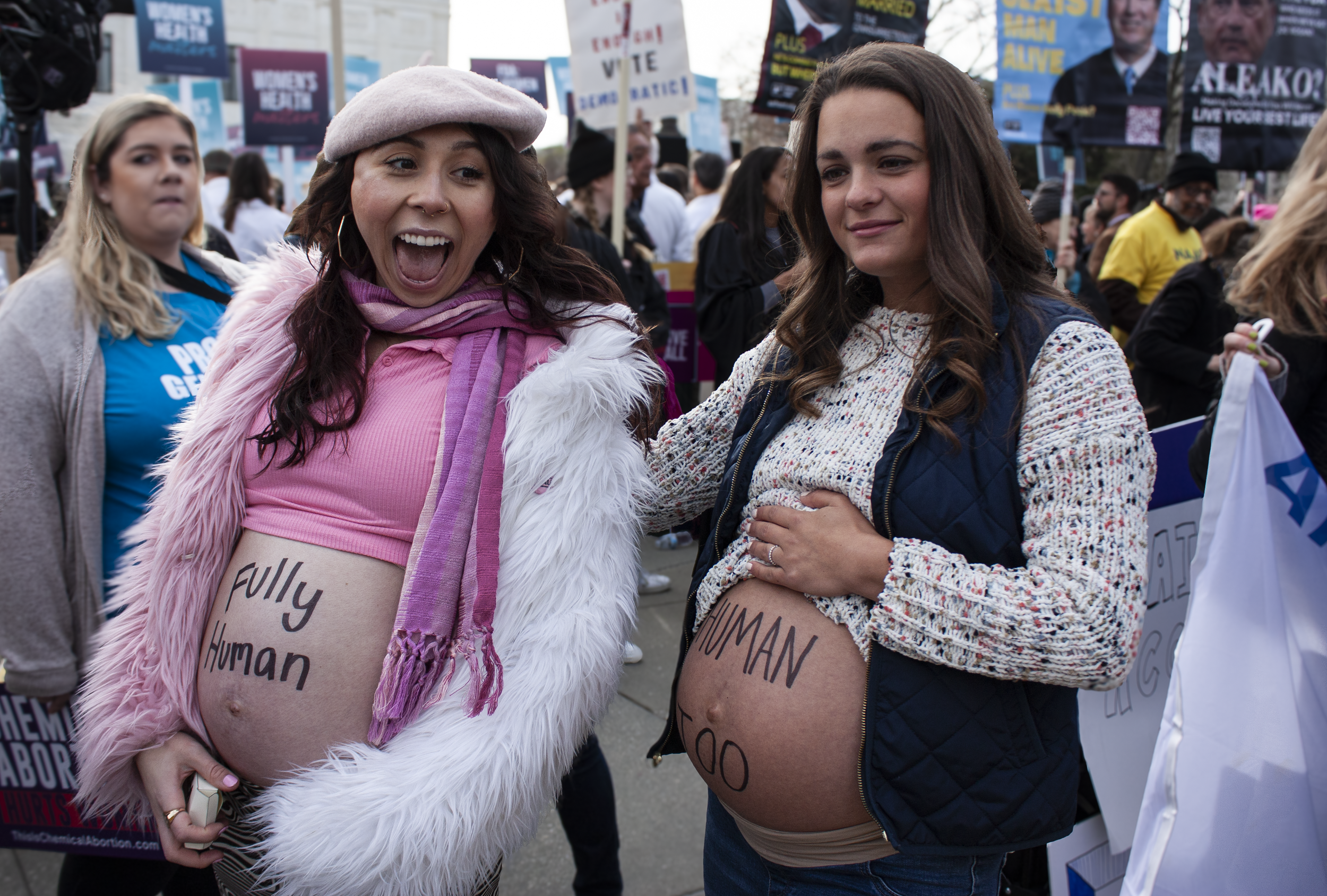 Two pregnant women at a protest; one with "Fully Human" written on her belly, and the other with "Human Too." Both are in a crowd holding signs.